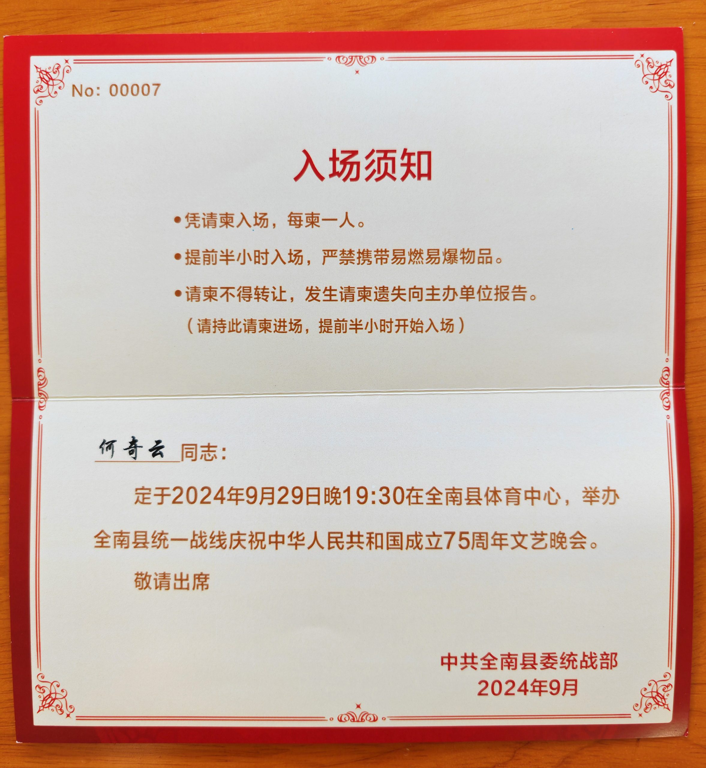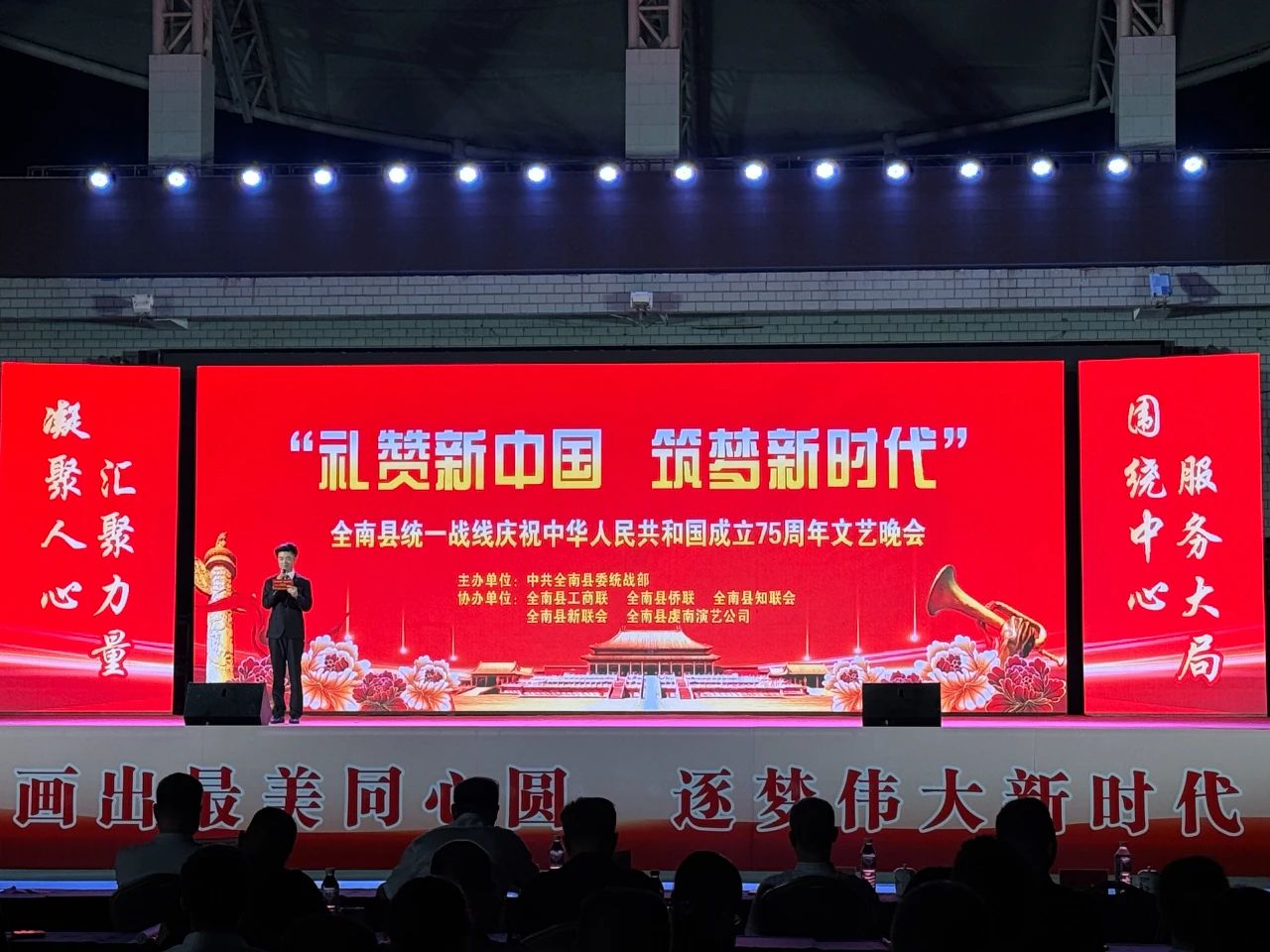 9月29日晚,“礼赞新中国 筑梦新时代” 全南县统一战线庆祝中华人民共和国成立75周年文艺晚会在县体育中心举行,市委统战部二级巡视员钟贤军,县委副书记、县长边建忠、县人大主任马石旺、县政协主席黄健及县领导冯建全、朱新梅、朱旭、彭智军、刘宏春、王昂、杨霖霖等在家的县四套班子领导、人武部部长、法检两长出席活动,县委统战工作领导小组成员及统一战线成员代表140余人欢聚一堂,同时吸引了数千名群众现场观看。