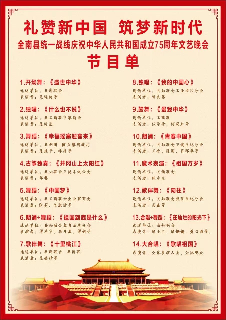 县知联会组织党外知识分子代表带来的古筝独奏《井冈山上太阳红》、朗诵《祖国到底是什么》、独唱《我的中国心》、朗诵《青春中国》、歌伴舞《向往》、合唱《在灿烂的阳光下》,县新联会和县侨联共同带来的舞蹈《十里桃江》及县剧团、瑶族村代表带来的《幸福瑶寨迎客来》。